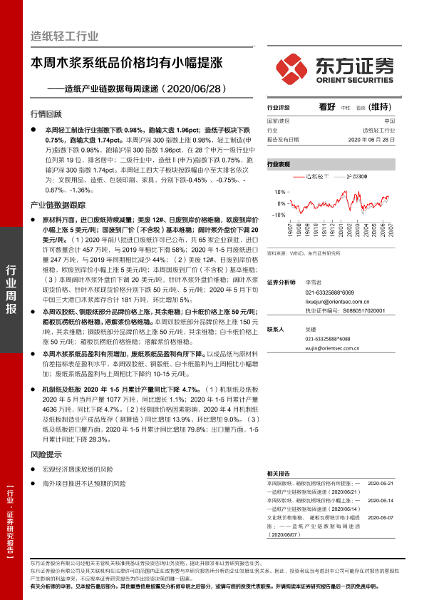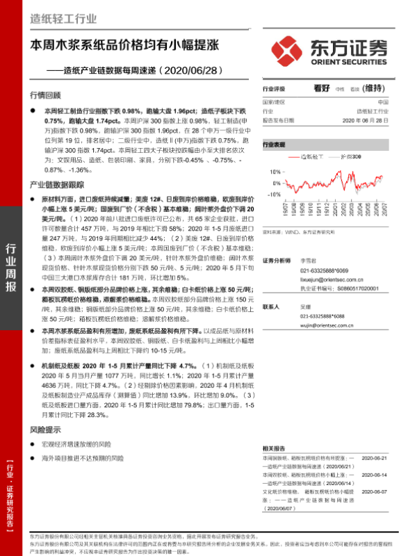 【东方证券】【20200628】20200628-东方证券-造纸产业链数据每周速递:本周木浆系纸品价格均有小幅提涨-15页