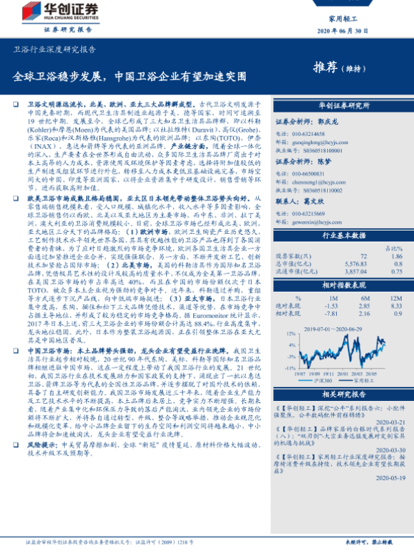 【华创证券】【20200630】20200630-华创证券-卫浴行业深度研究报告:全球卫浴稳步发展,中国卫浴企业有望加速突围-31页