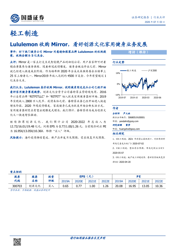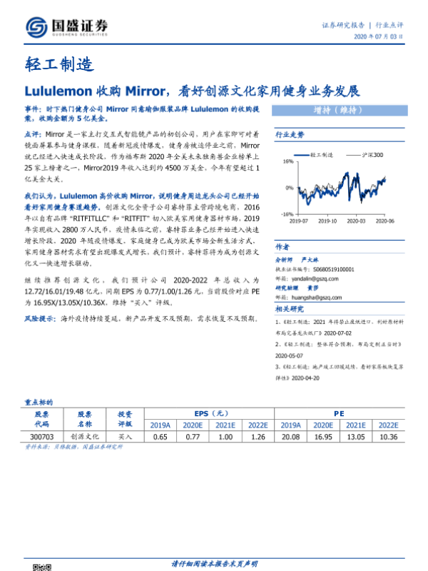 【国盛证券】【20200703】轻工制造:Lululemon收购Mirror,看好创源文化家用健身业务发展-2页