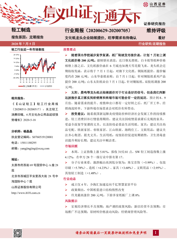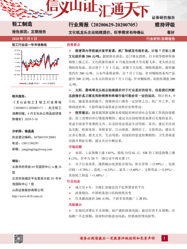 【山西证券】【20200705】20200705-山西证券-轻工制造行业周报:文化纸龙头企业陆续提价,旺季需求有待确认-13页