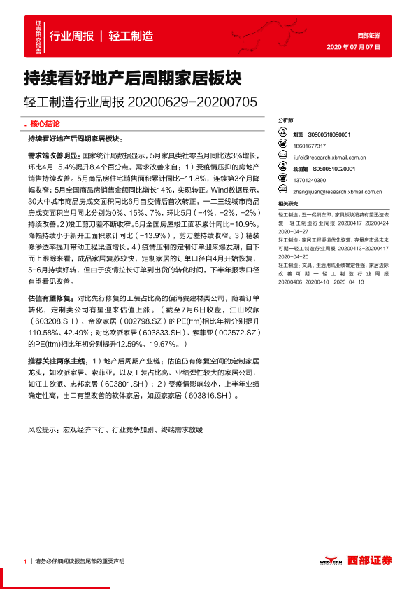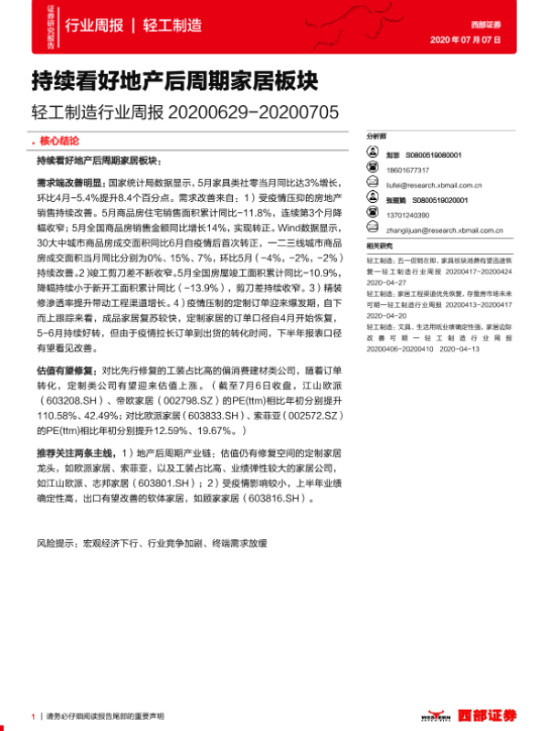 【西部证券】【20200707】20200707-西部证券-轻工制造行业周报:持续看好地产后周期家居板块-12页