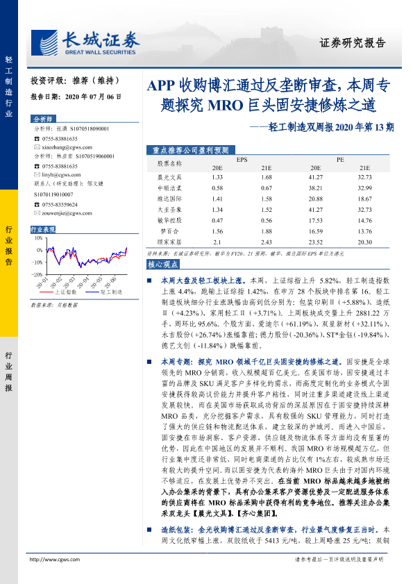 【长城证券】【20200706】20200706-长城证券-轻工制造双周报2020年第13期:APP收购博汇通过反垄断审查,本周专题探究MRO巨头固安捷修炼之道-32页