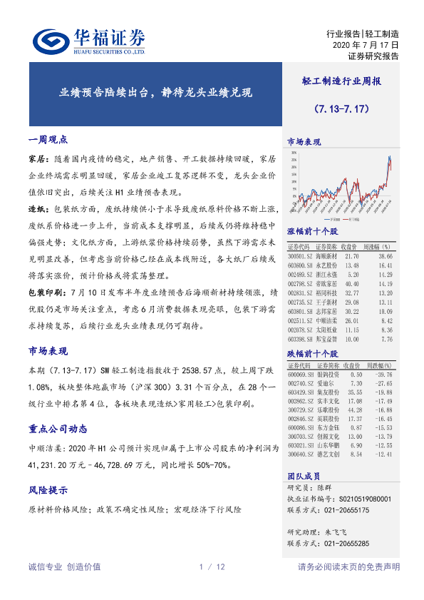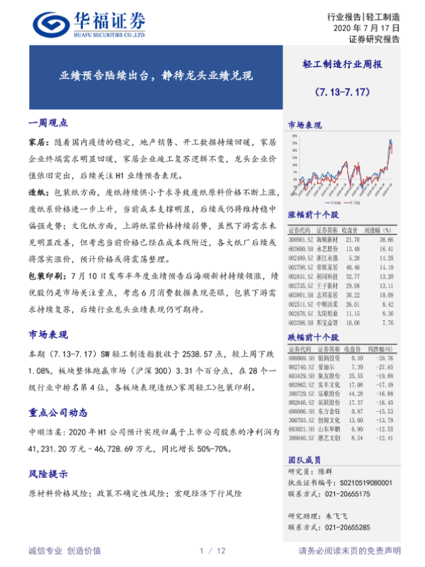 【华福证券】【20200717】20200717-华福证券-轻工制造行业周报:业绩预告陆续出台,静待龙头业绩兑现-12页
