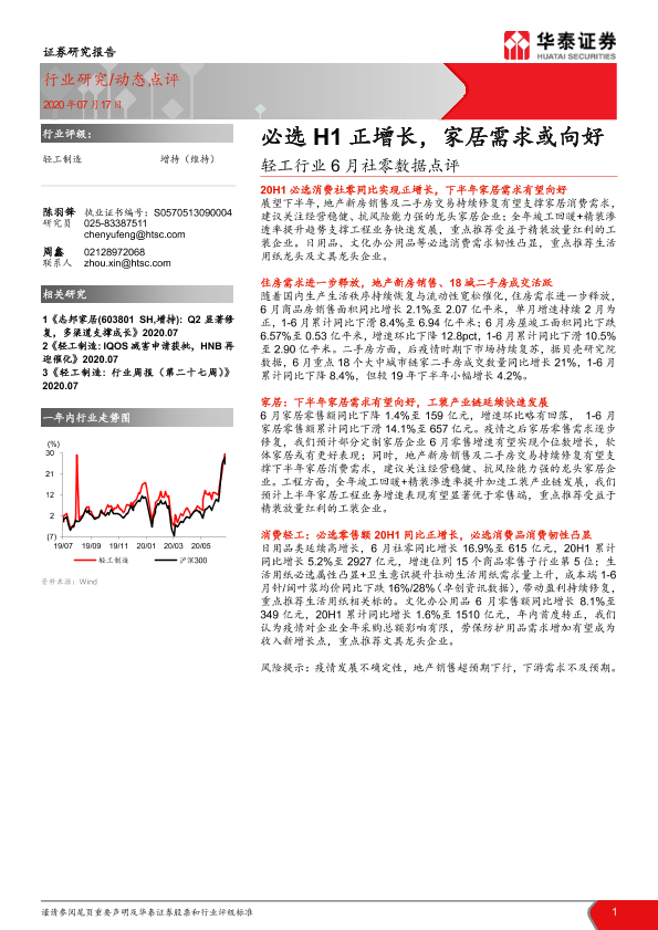【华泰证券】【20200717】轻工行业6月社零数据点评:必选H1正增长,家居需求或向好-5页