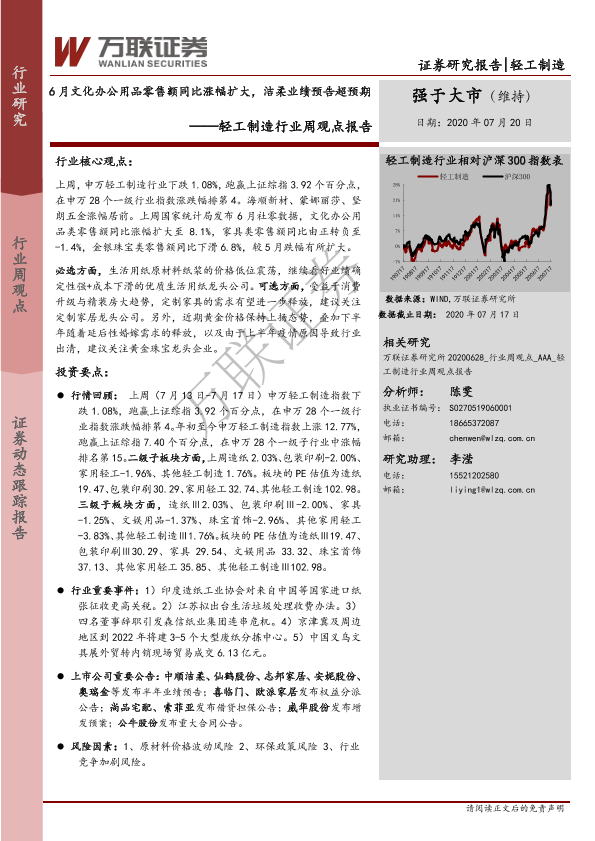 【万联证券】【20200720】20200720-万联证券-轻工制造行业周观点报告:6月文化办公用品零售额同比涨幅扩大,洁柔业绩预告超预期-10页
