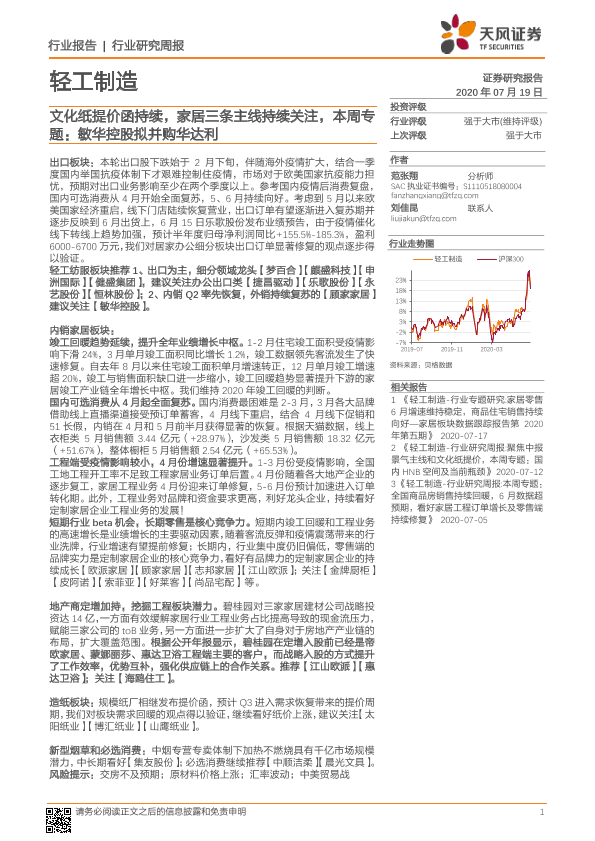 【天风证券】【20200719】20200719-天风证券-轻工制造行业研究周报:文化纸提价函持续,家居三条主线持续关注,本周专题:敏华控股拟并购华达利-19页