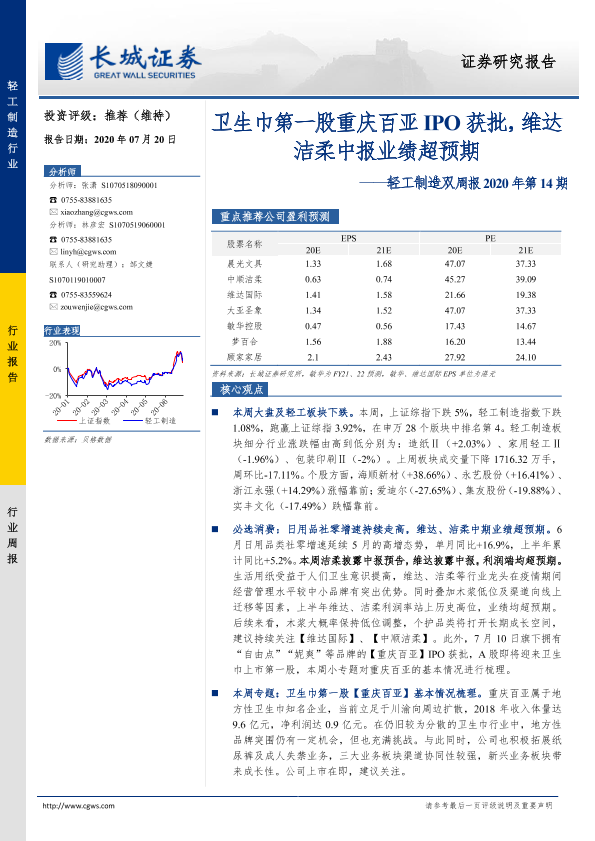 【长城证券】【20200720】轻工制造双周报2020年第14期:卫生巾第一股重庆百亚IPO获批,维达洁柔中报业绩超预期-31页