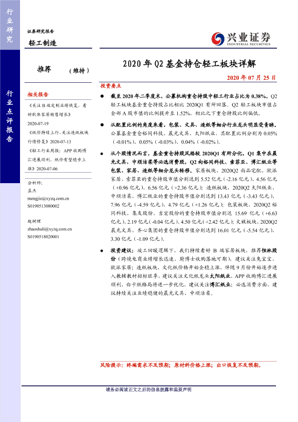 【兴业证券】【20200725】2020年Q2基金持仓轻工板块详解-5页
