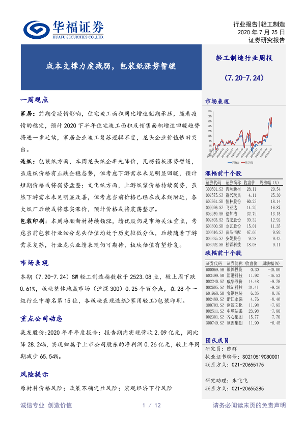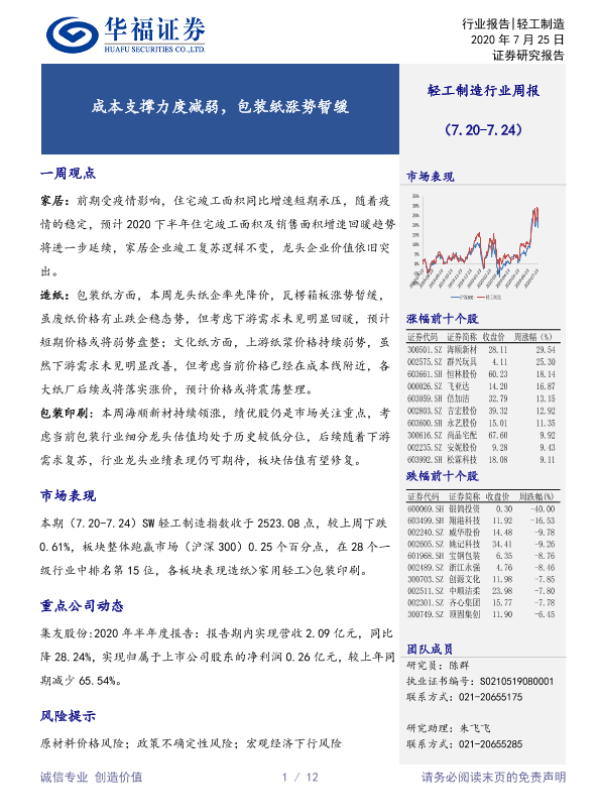 【华福证券】【20200725】20200725-华福证券-轻工制造行业周报:成本支撑力度减弱,包装纸涨势暂缓-12页