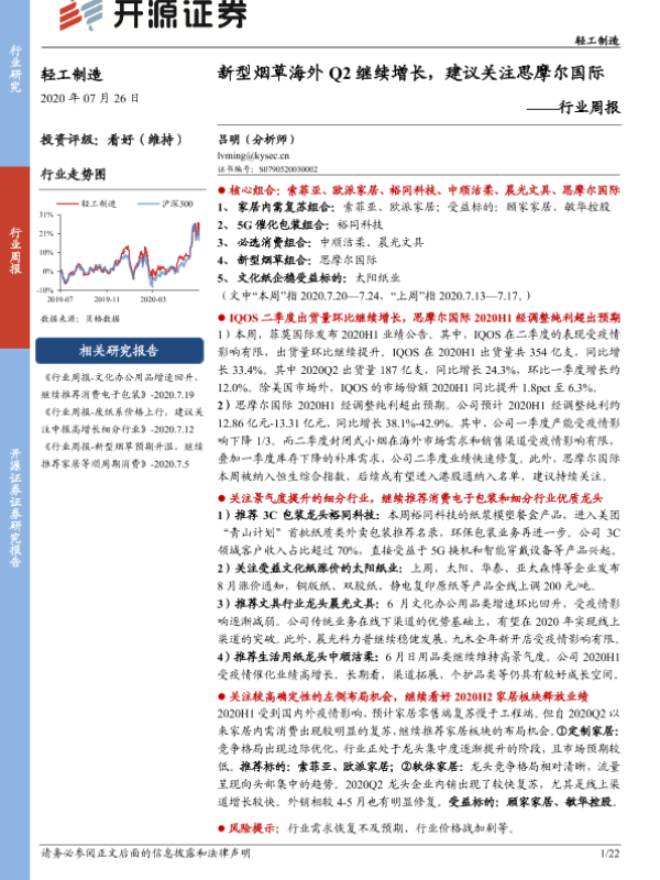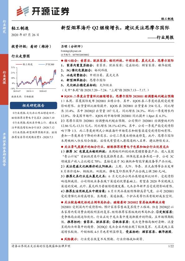 【开源证券】【20200726】轻工制造行业周报:新型烟草海外Q2继续增长,建议关注思摩尔国际-22页