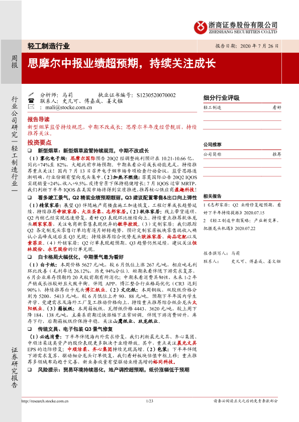 【浙商证券】【20200726】20200726-浙商证券-轻工制造行业周报:思摩尔中报业绩超预期,持续关注成长-23页