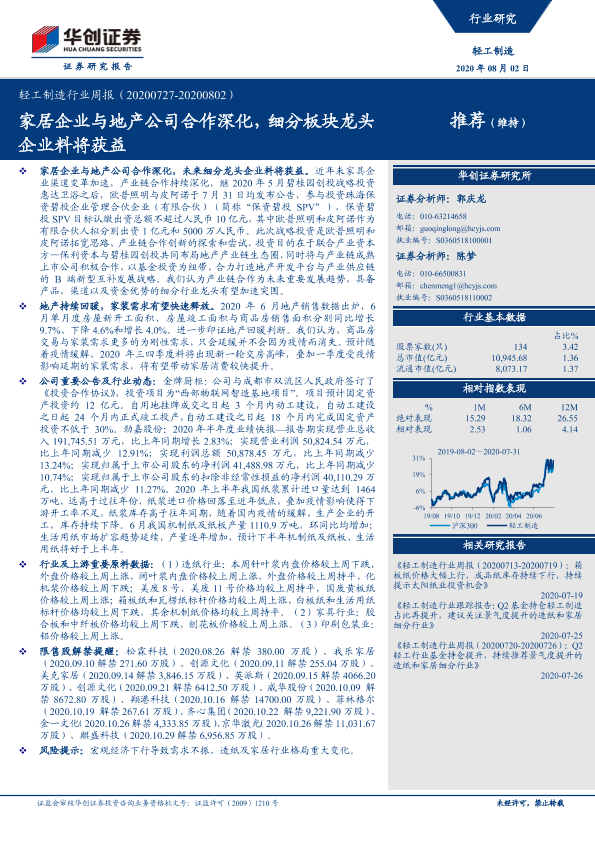 【华创证券】【20200802】轻工制造行业周报:家居企业与地产公司合作深化,细分板块龙头企业料将获益-14页