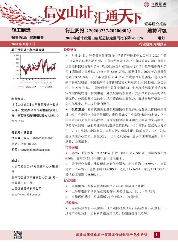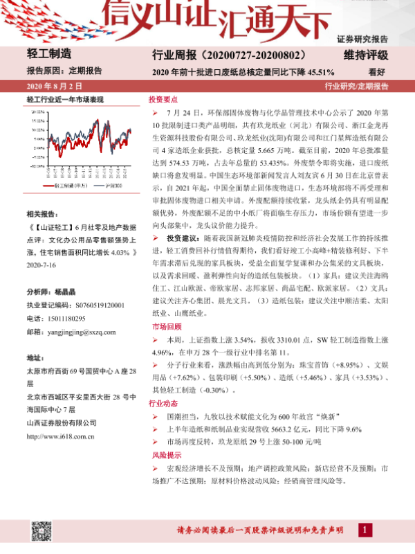 市场分析 环境保护 股票评级 轻工制造 进口废纸