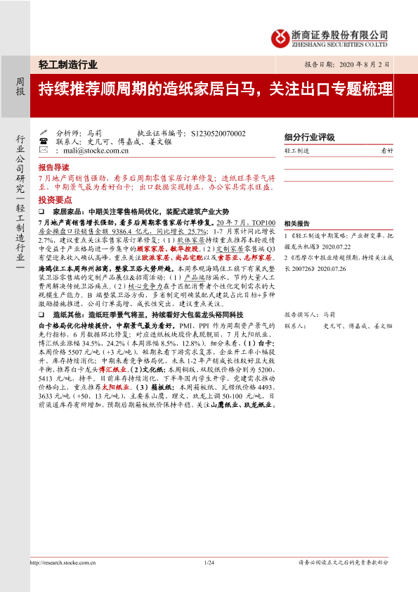 【浙商证券】【20200802】轻工制造行业周报:持续推荐顺周期的造纸家居白马,关注出口专题梳理-24页