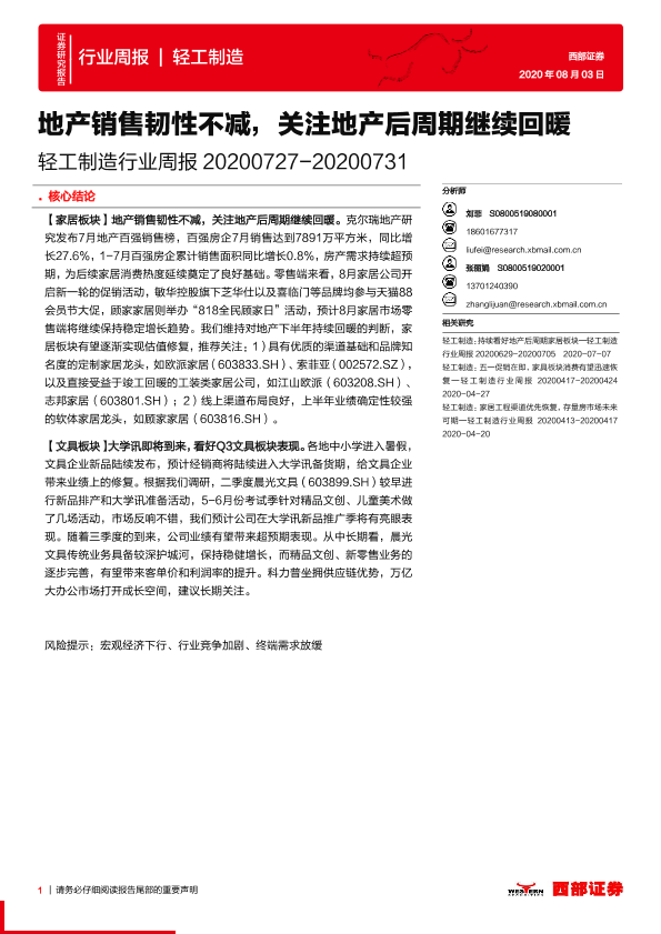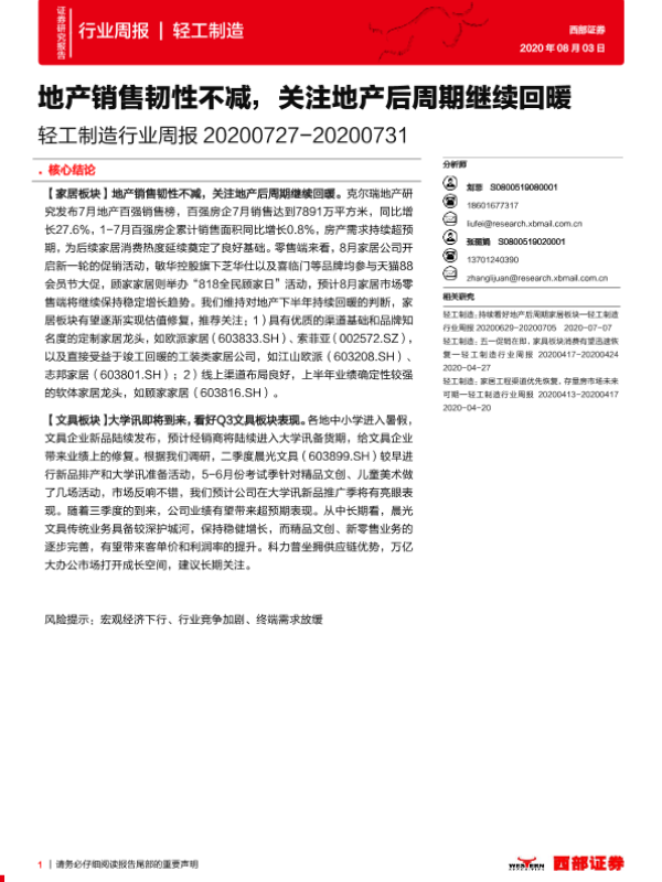 【西部证券】【20200803】20200803-西部证券-轻工制造行业周报:地产销售韧性不减,关注地产后周期继续回暖-12页
