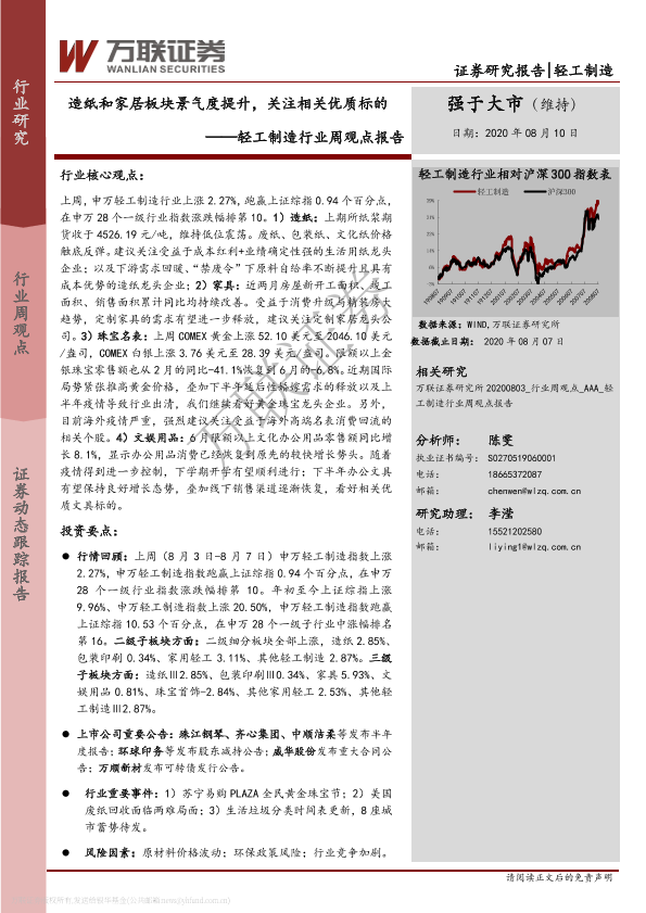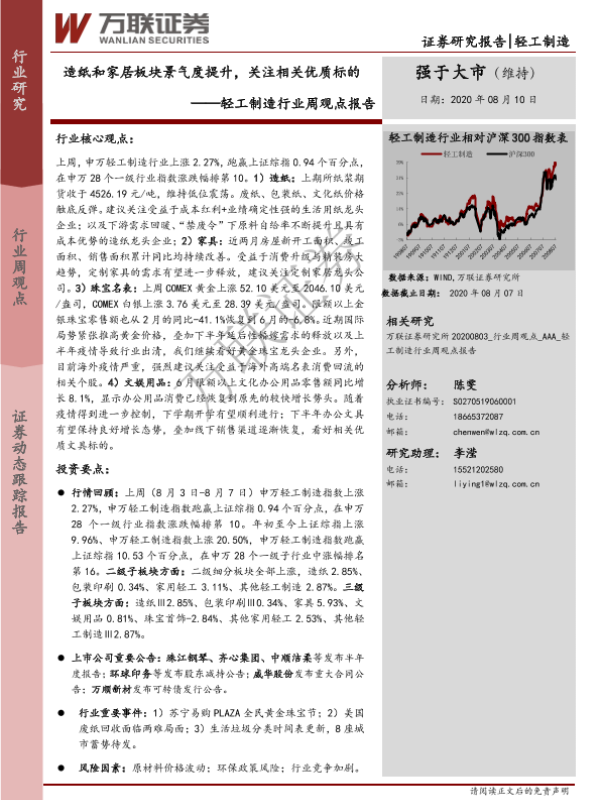 【万联证券】【20200810】20200810-万联证券-轻工制造行业周观点报告:造纸和家居板块景气度提升,关注相关优质标的-12页