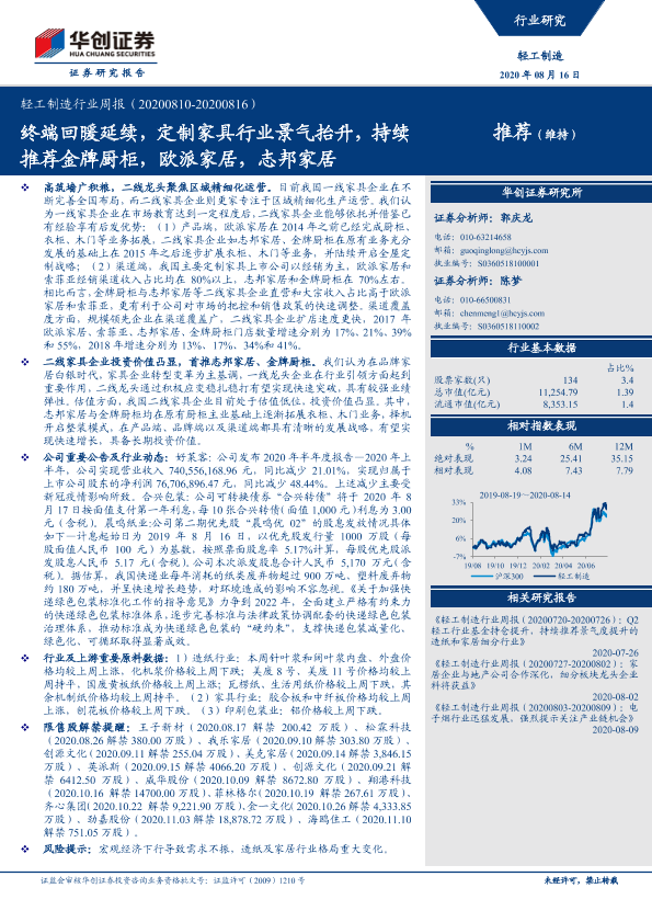 【华创证券】【20200816】20200816-华创证券-轻工制造行业周报:终端回暖延续,定制家具行业景气抬升,持续推荐金牌厨柜,欧派家居,志邦家居-14页