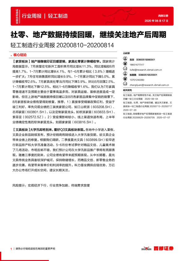 【西部证券】【20200817】20200817-西部证券-轻工制造行业周报:社零、地产数据持续回暖,继续关注地产后周期-12页