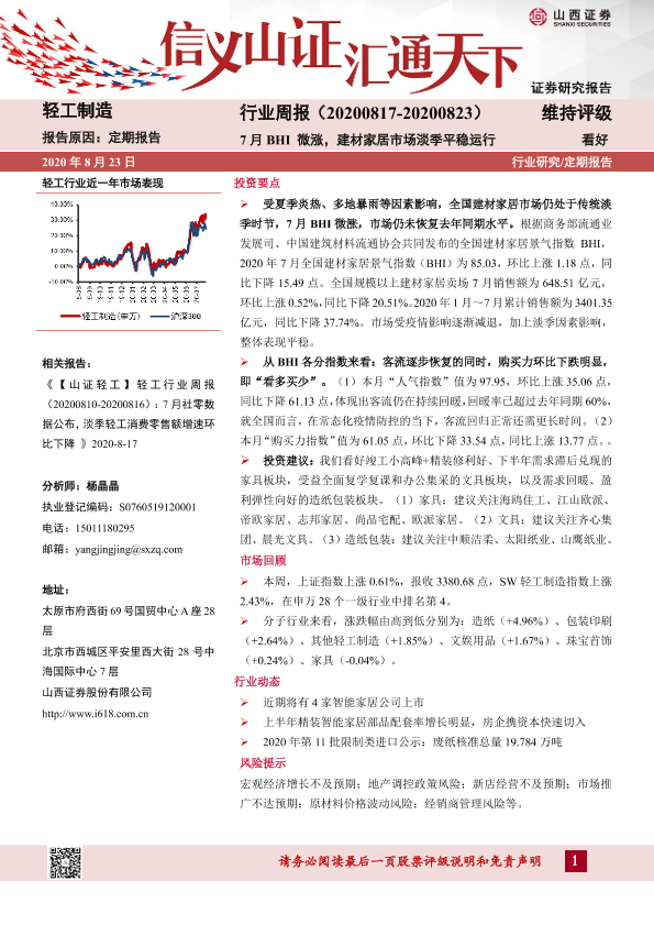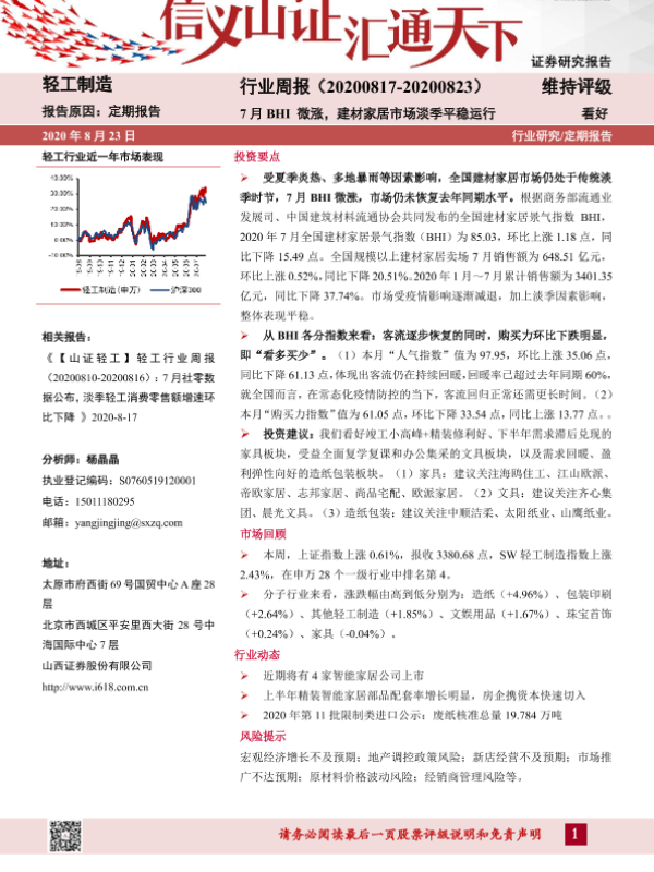 【山西证券】【20200823】轻工制造行业周报:7月BHI微涨,建材家居市场淡季平稳运行-14页