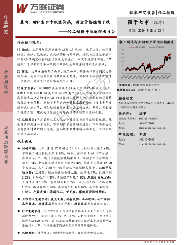 【万联证券】【20200823】轻工制造行业周观点报告:晨鸣、APP发白卡纸涨价函,黄金价格继续下跌-13页