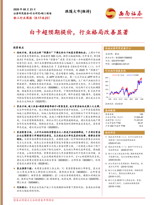 【西南证券】【20200823】20200823-西南证券-轻工行业周报:白卡超预期提价,行业格局改善显著-14页
