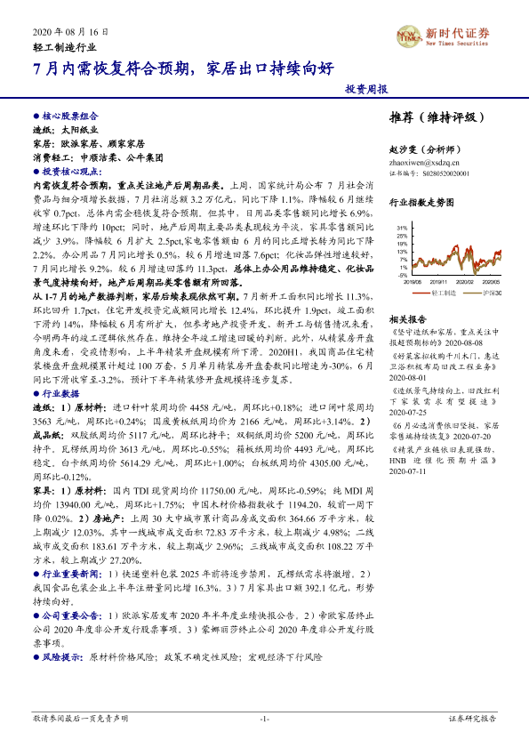 【新时代证券】【20200816】20200816-新时代证券-轻工制造行业投资周报:7月内需恢复符合预期,家居出口持续向好-24页