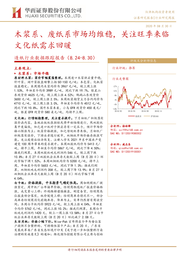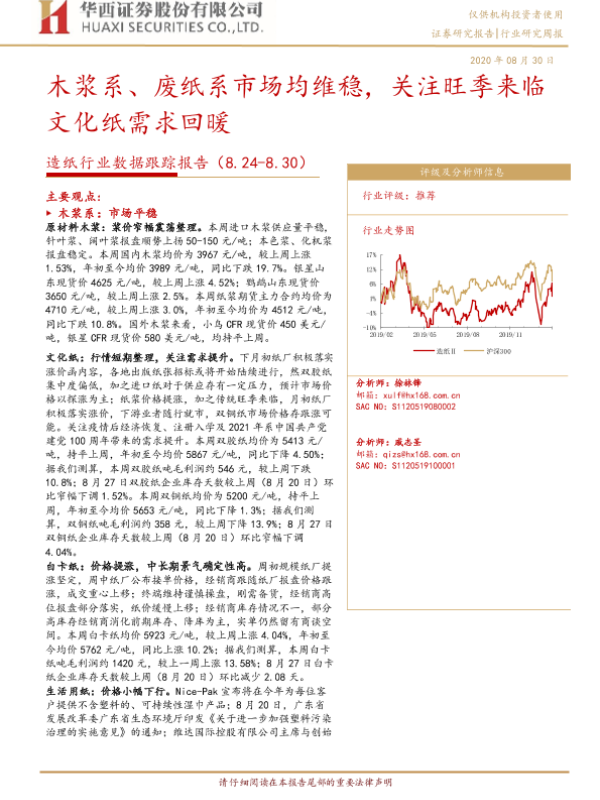 【华西证券】【20200830】20200830-华西证券-造纸行业数据跟踪报告:木浆系、废纸系市场均维稳,关注旺季来临文化纸需求回暖-11页