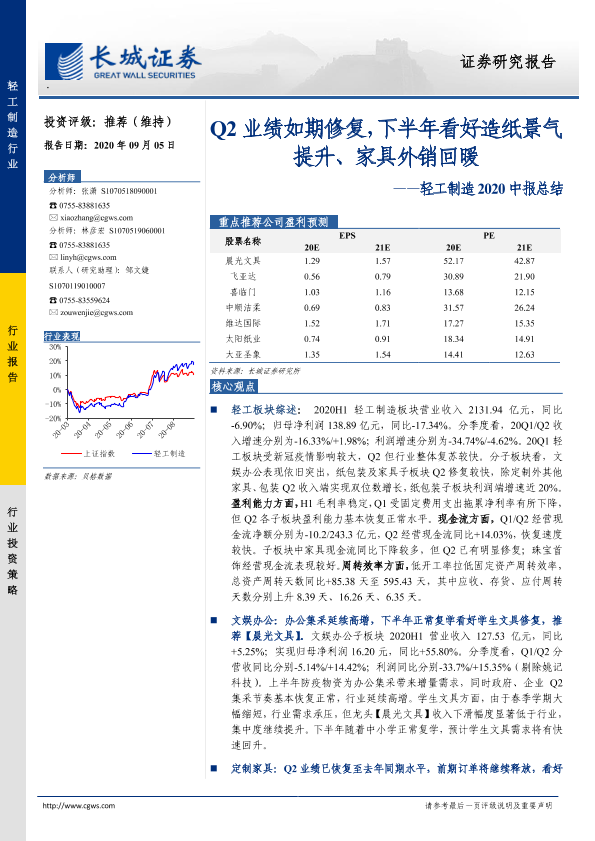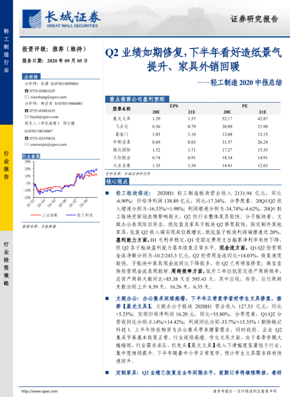 【长城证券】【20200905】轻工制造2020中报总结:Q2业绩如期修复,下半年看好造纸景气提升、家具外销回暖-37页