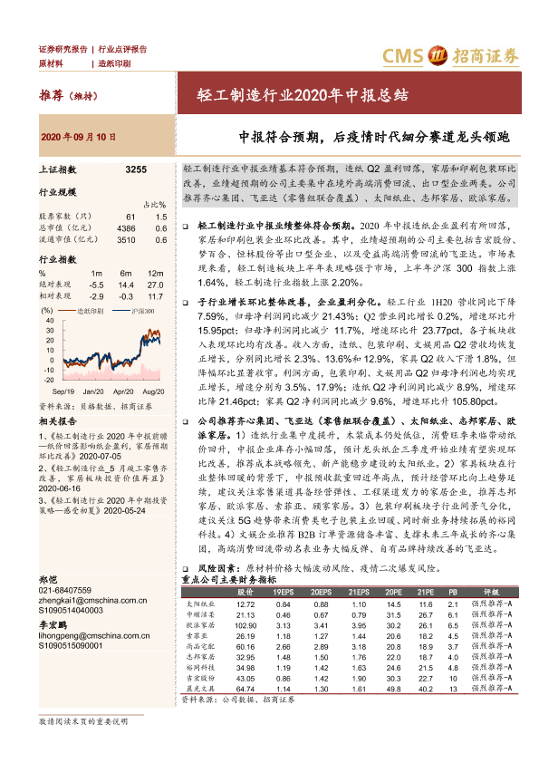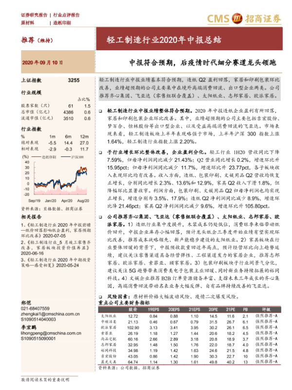 【海通证券】【20200910】轻工制造行业2020年中报总结:中报符合预期,后疫情时代细分赛道龙头领跑-9页
