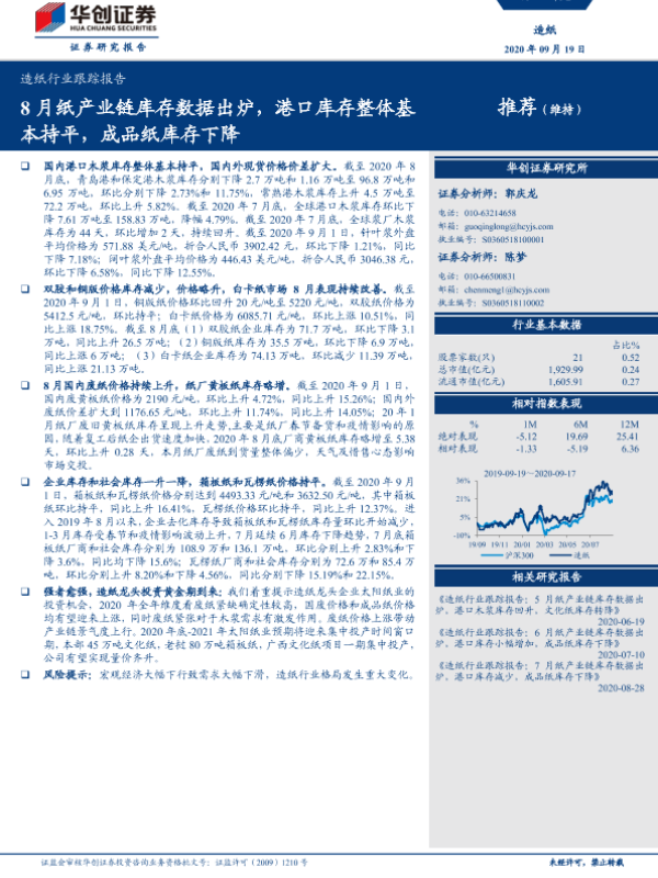 【华创证券】【20200919】20200919-华创证券-造纸行业跟踪报告:8月纸产业链库存数据出炉,港口库存整体基本持平,成品纸库存下降-11页