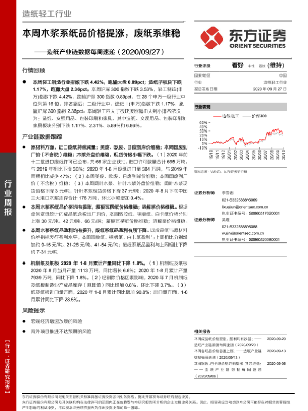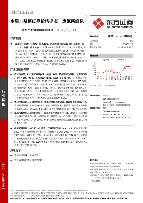【东方证券】【20200927】20200927-东方证券-造纸产业链数据每周速递:本周木浆系纸品价格提涨,废纸系维稳-14页
