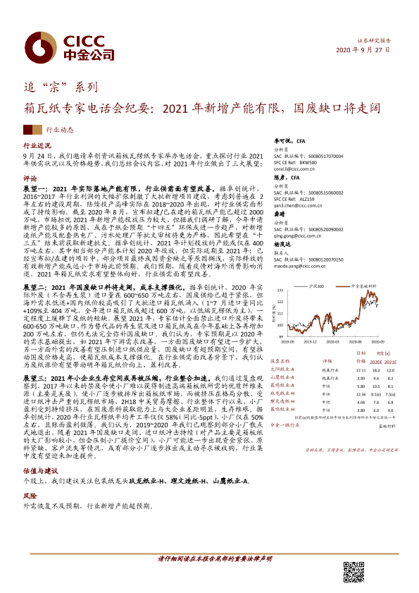 【中金公司】【20200927】追“宗”系列:箱瓦纸专家电话会纪要:2021年新增产能有限,国废缺口将走阔-6页