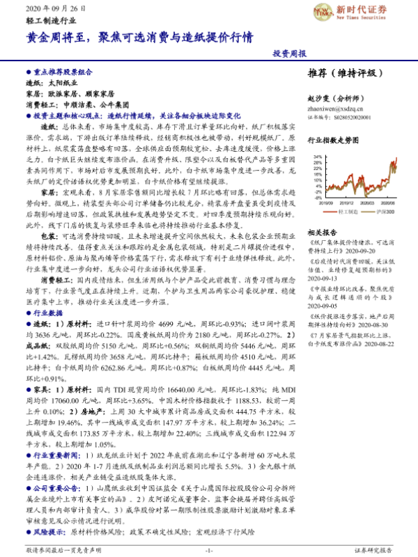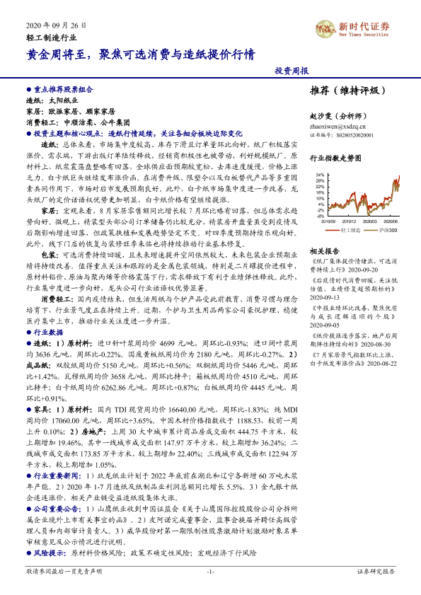 【新时代证券】【20200926】20200926-新时代证券-轻工制造行业投资周报:黄金周将至,聚焦可选消费与造纸提价行情-22页