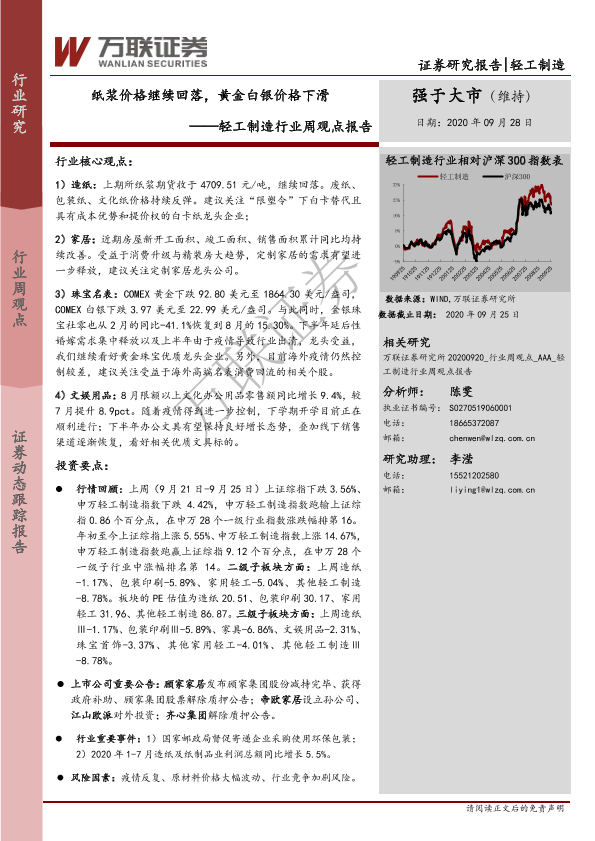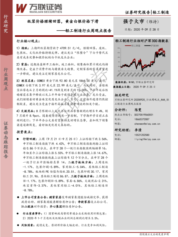 【万联证券】【20200928】20200928-万联证券-轻工制造行业周观点报告:纸浆价格继续回落,黄金白银价格下滑-12页