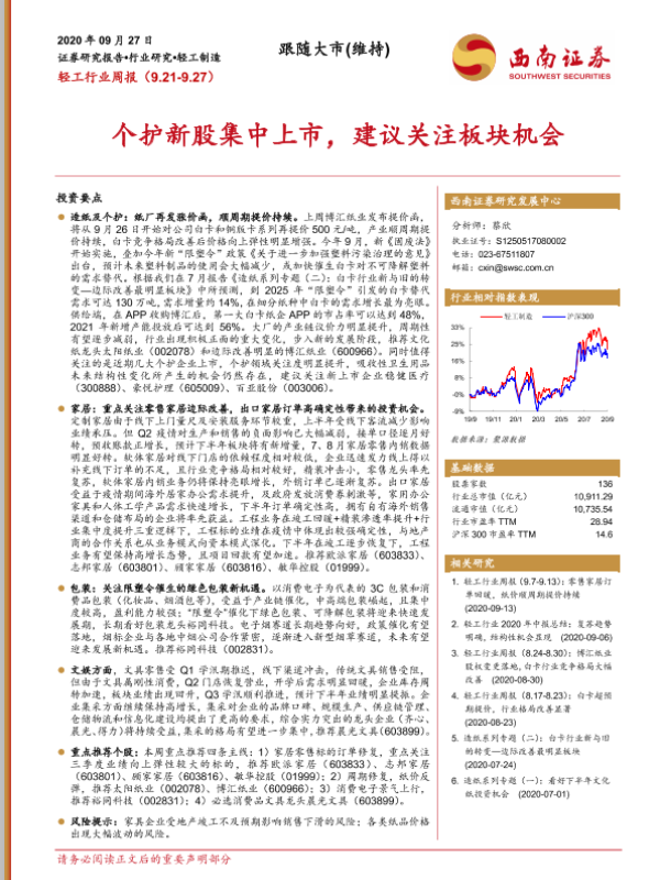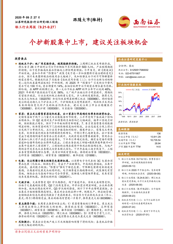 【西南证券】【20200927】20200927-西南证券-轻工行业周报:个护新股集中上市,建议关注板块机会-15页