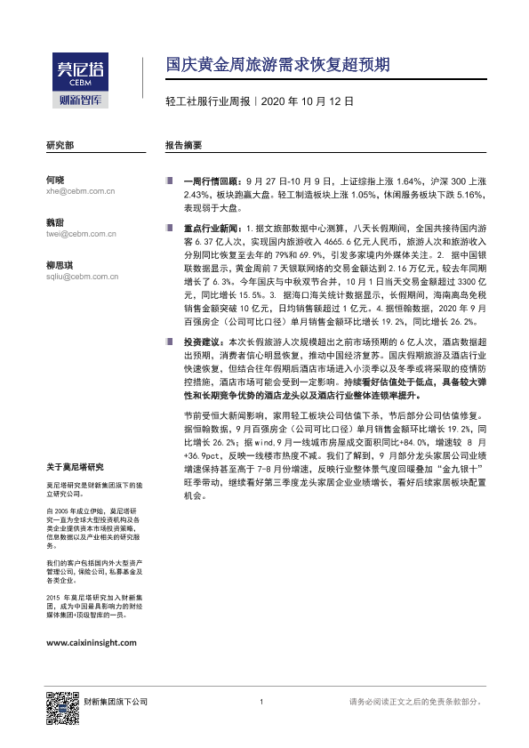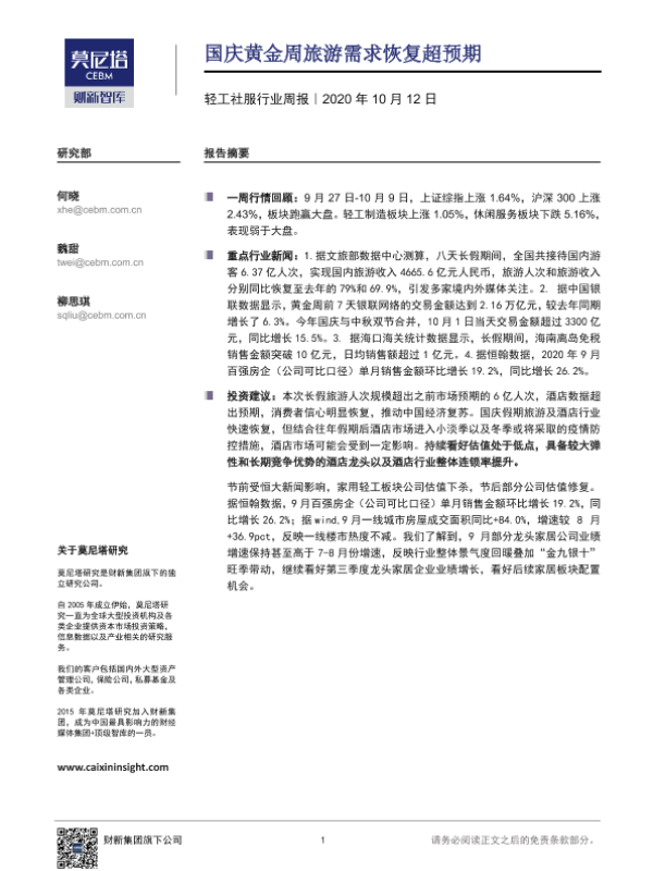 【莫尼塔研究】【20201012】轻工社服行业周报:国庆黄金周旅游需求恢复超预期-8页