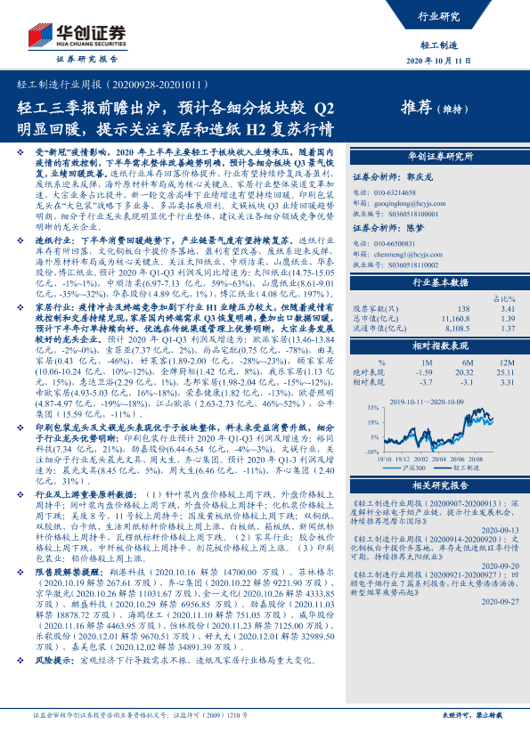 【华创证券】【20201011】20201011-华创证券-轻工制造行业周报:轻工三季报前瞻出炉,预计各细分板块较Q2明显回暖,提示关注家居和造纸H2复苏行情-14页