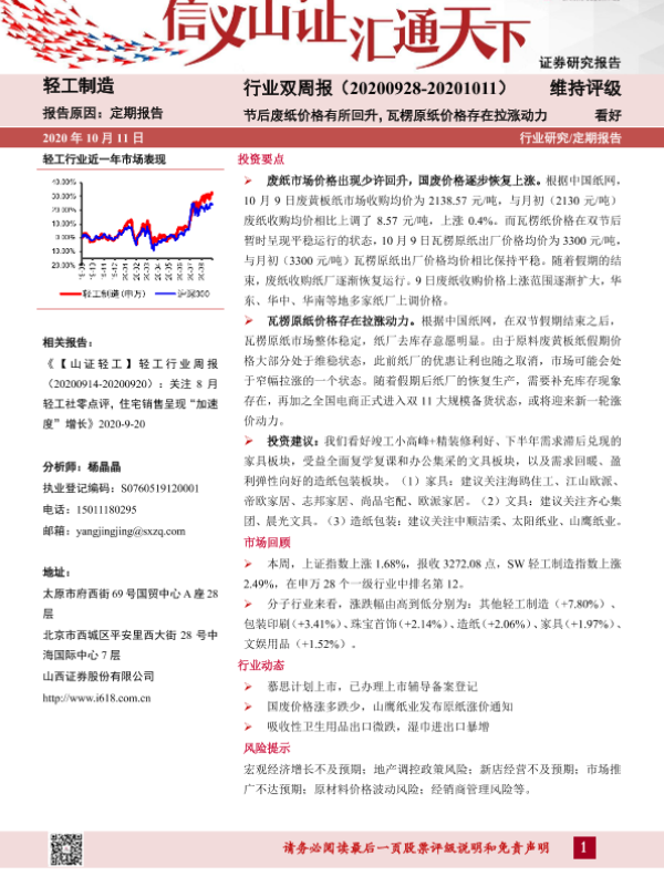 【山西证券】【20201011】轻工行业双周报:节后废纸价格有所回升,瓦楞原纸价格存在拉涨动力-13页