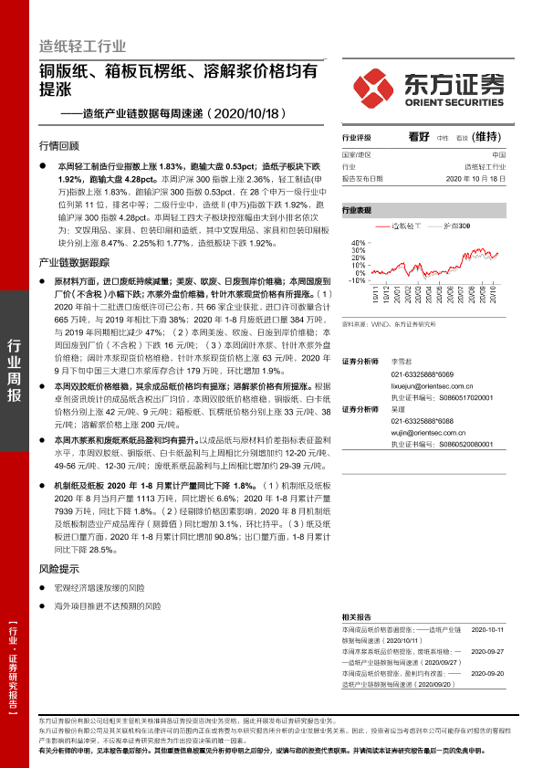 【东方证券】【20201018】20201018-东方证券-造纸产业链数据每周速递:铜版纸、箱板瓦楞纸、溶解浆价格均有提涨-15页