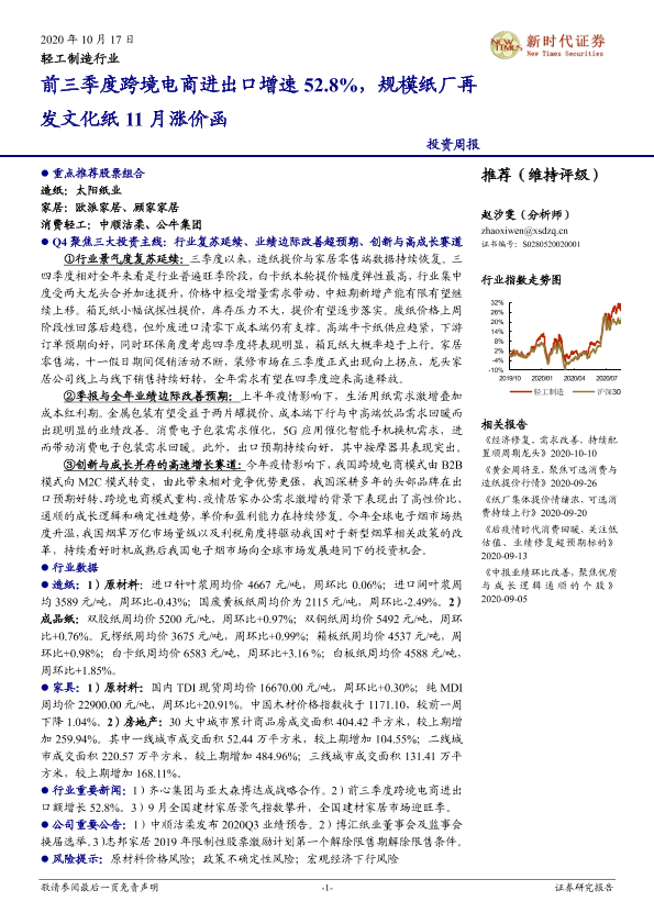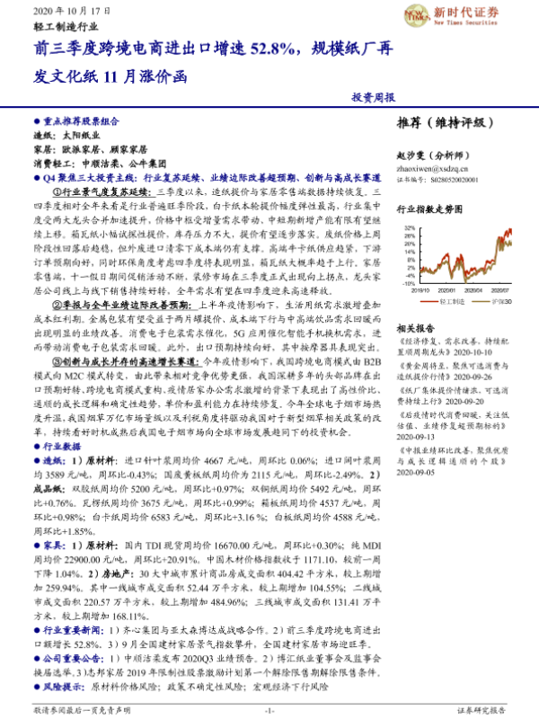 【新时代证券】【20201017】20201017-新时代证券-轻工制造行业:前三季度跨境电商进出口增速52.8%,规模纸厂再发文化纸11月涨价函-22页