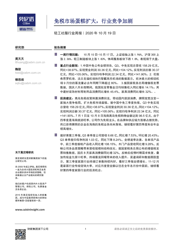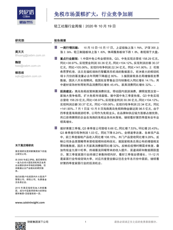 【莫尼塔研究】【20201019】轻工社服行业周报:免税市场蛋糕扩大,行业竞争加剧-8页