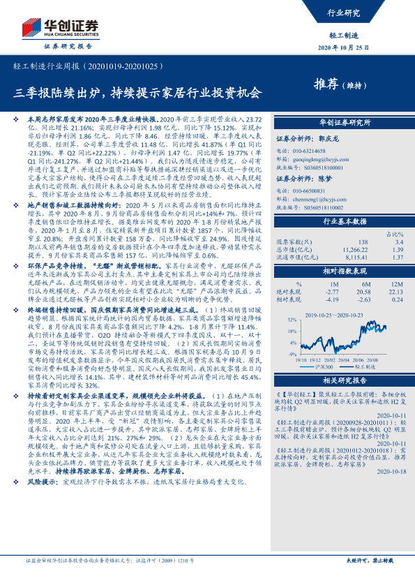 【华创证券】【20201025】轻工制造行业周报:三季报陆续出炉,持续提示家居行业投资机会-14页