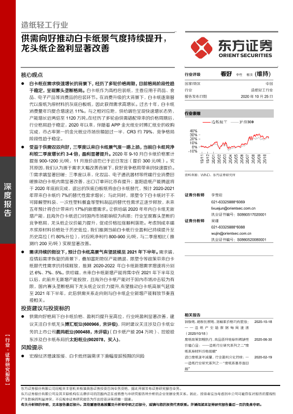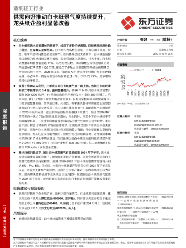 【东方证券】【20201025】供需向好推动白卡纸景气度持续提升,龙头纸企盈利显著改善-23页