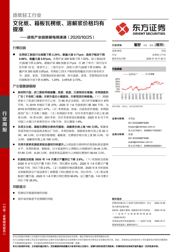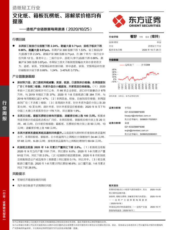 【东方证券】【20201025】20201025-东方证券-造纸产业链数据每周速递:文化纸、箱板瓦楞纸、溶解浆价格均有提涨-15页