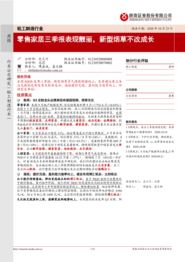 【浙商证券】【20201025】轻工制造行业:零售家居三季报表现靓丽,新型烟草不改成长-25页