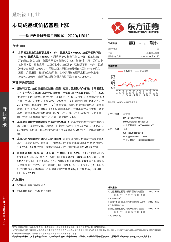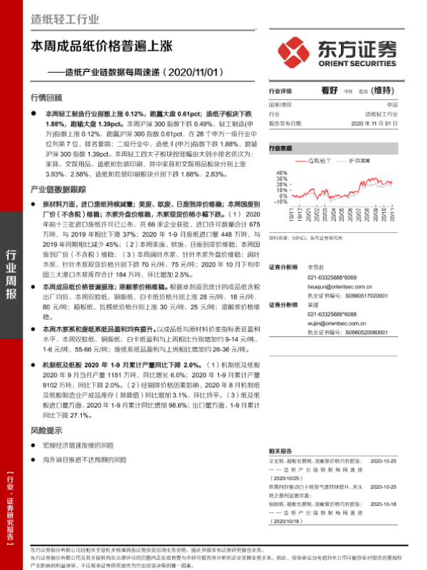 【东方证券】【20201101】20201101-东方证券-造纸产业链数据每周速递-本周成品纸价格普遍上涨-15页