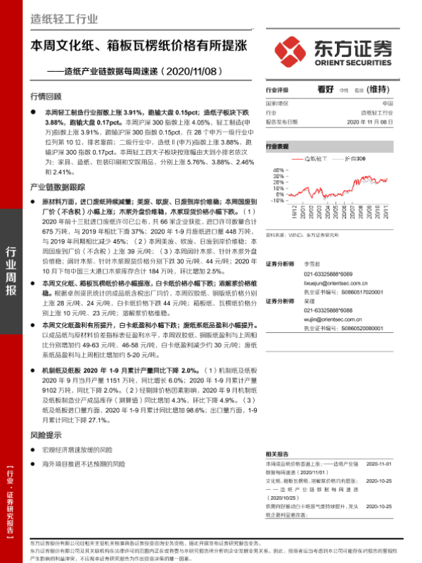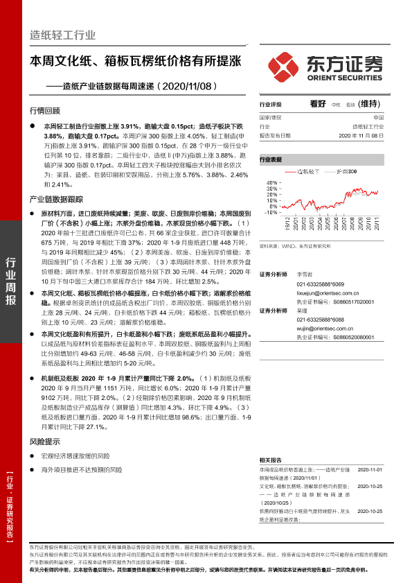 【东方证券】【20201108】20201108-东方证券-造纸产业链数据每周速递:本周文化纸、箱板瓦楞纸价格有所提涨-15页