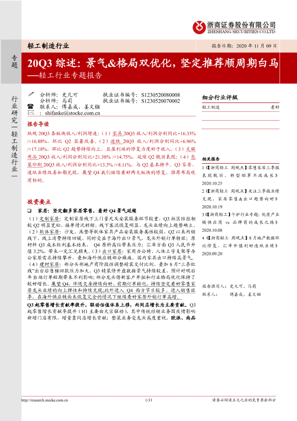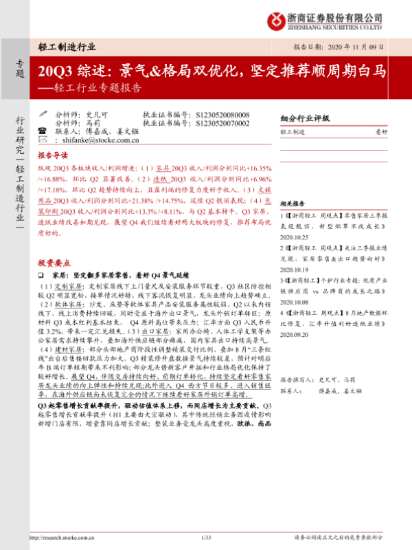 【浙商证券】【20201109】20201109-浙商证券-轻工行业专题报告20Q3综述:景气&格局双优化,坚定推荐顺周期白马-33页