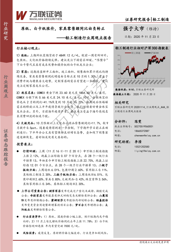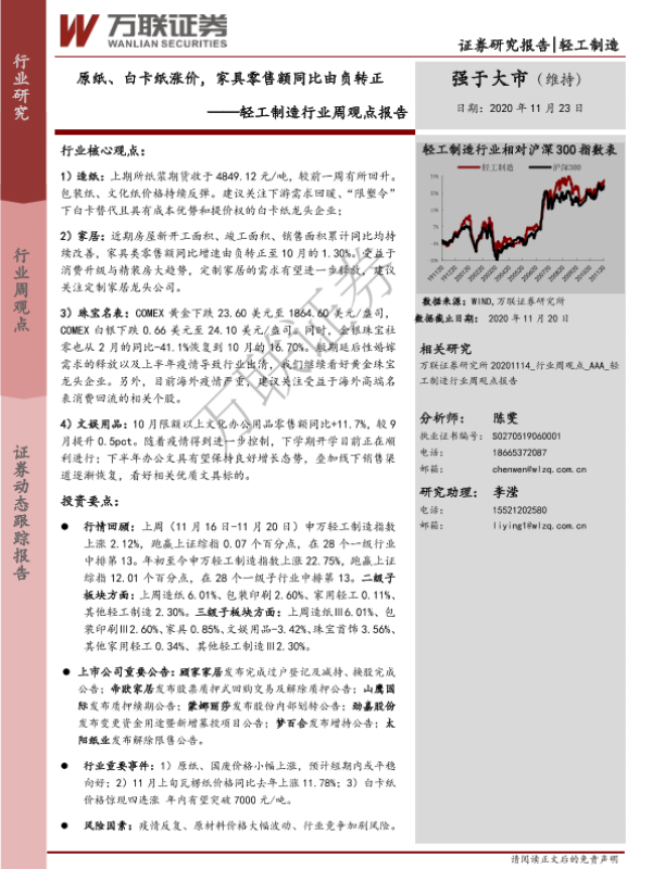 【万联证券】【20201123】20201123-万联证券-轻工制造行业周观点报告:原纸、白卡纸涨价,家具零售额同比由负转正-12页