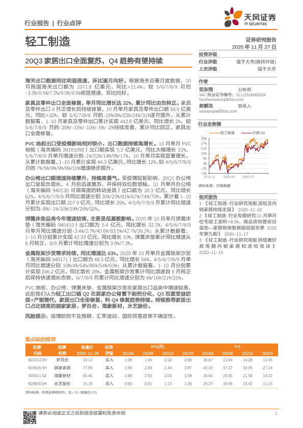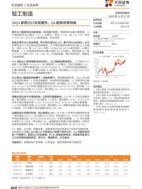 【天风证券】【20201127】轻工制造行业点评:20Q3家居出口全面复苏,Q4趋势有望持续-5页